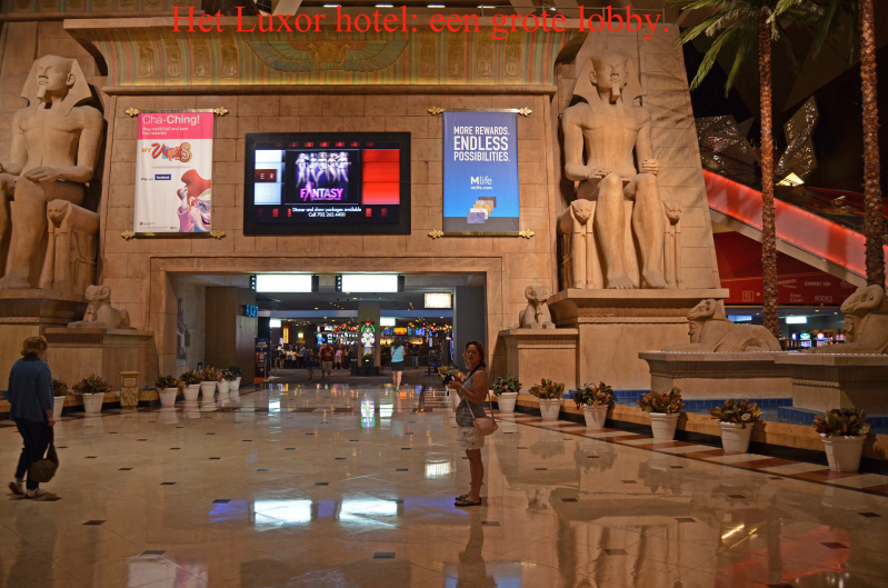 We kiezen voor het Luxor hotel. Zeker niet het grootste (4407 kamers) maar wel goed voor een aantal records. Zo is de lobby de grootste van de wereld:820.000 kubieke meter. De sfinx voor het hotel is 34 meter hoog!!!. De lamp bovenop de punt van de piramide heeft een lichtsterkte van 42,3 miljard candela (1 candela is ongeveer de lichtsterkte van een kaars).