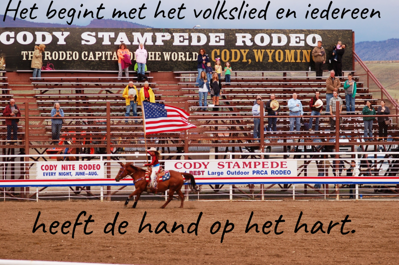 Of het nu om een honkbalwedstrijd, een rodeo, een superbowl, een potje knikkeren of een gun-fight gaat: steevast wordt de The Star-Spangled Banner gespeeld. Het volkslied van "de States". Dat enorme patriotisme is voor ons bijna niet te bevatten. Wij lallen alleen het Wilhelmus op Koningsdag na het nuttigen van wat liters van de Nederlandse variant van Budweiser.